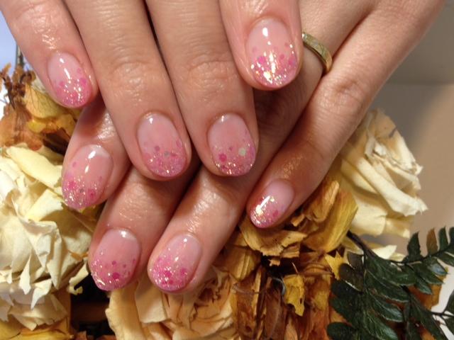本日のお客様ネイルです。 お久しぶりのネイルという事。ピンクのラメグラデーションにホログラムを散らしたシンプルなデザインですが、ジェルの透明感が際立って華やかなお手元になりました。