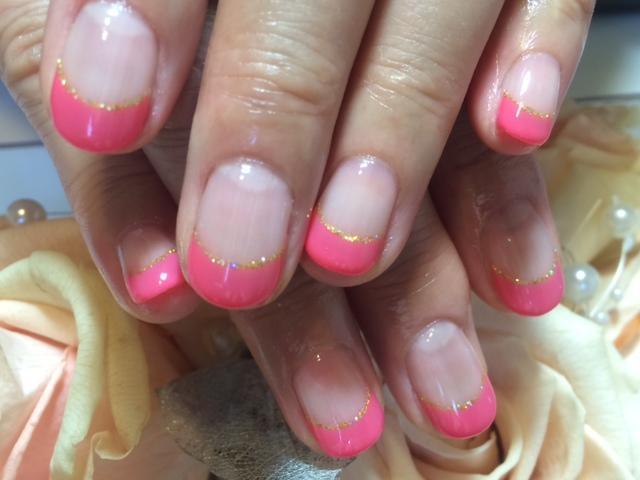 鮮やかなピンクのフレンチにゴールドのラメを合わせました。