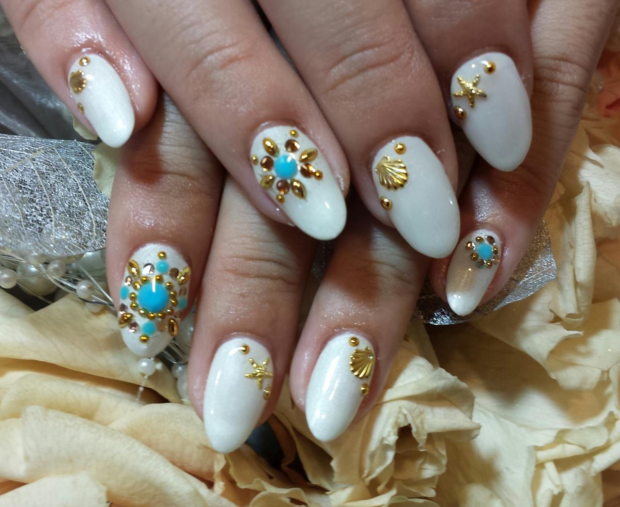 本日のお客様ネイルです。ヒトデ、貝のパーツを使って夏にピッタリのネイルをされました。