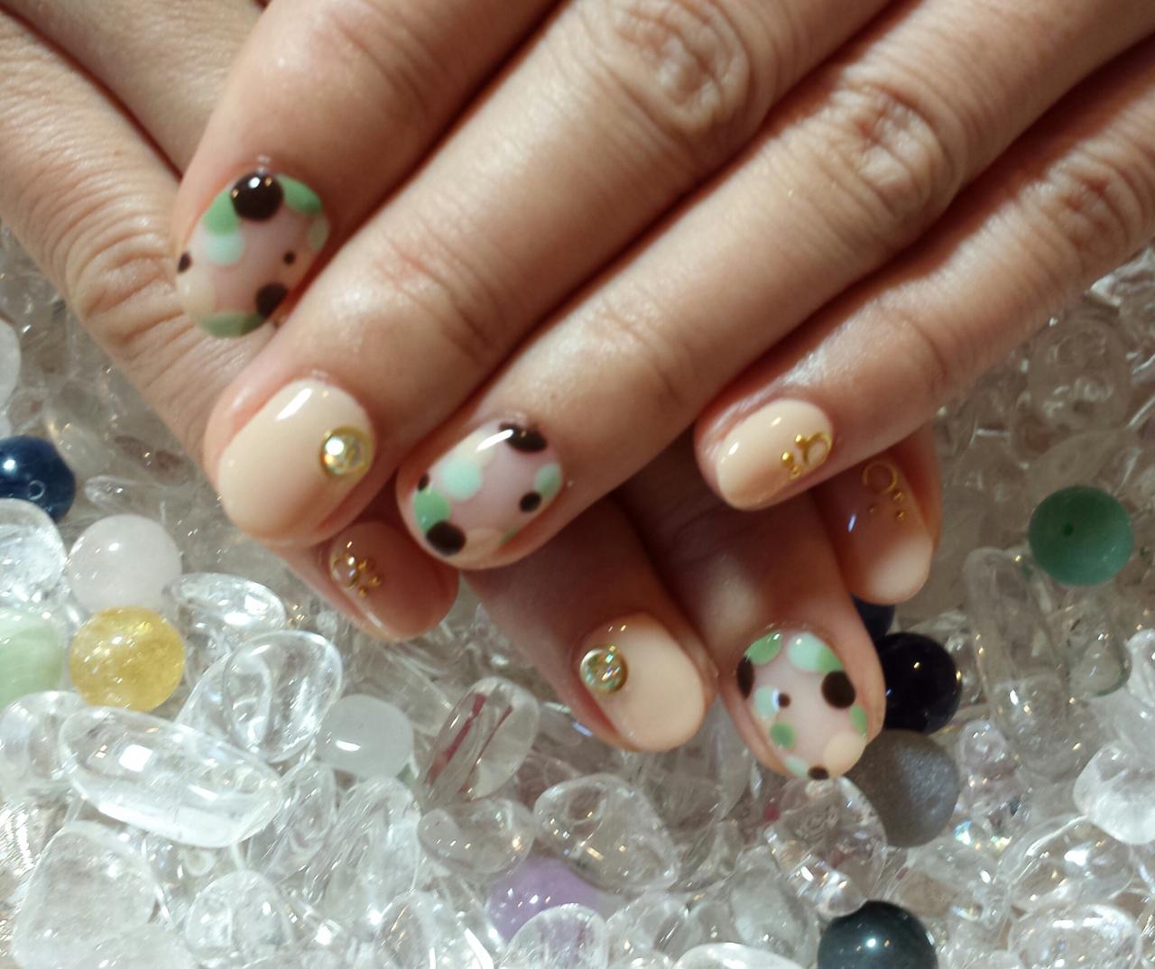 本日のお客様ネイルです。ドットはカモフラ柄(迷彩柄)をイメージさせる色の組み合わせで素敵です。キャンペーンネイルより選んで頂きました。 三木 有理