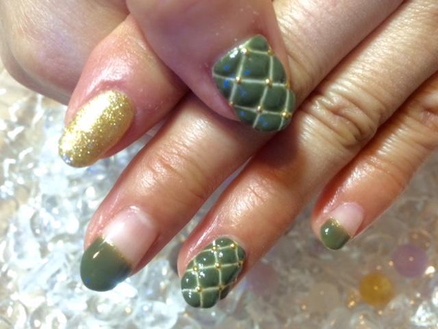 キャンペーンネイルから選んで頂きました。表面をプクプク盛り上げてキルティングの質感を出してみました。グリーンとゴールドの組み合わせも綺麗ですね☆