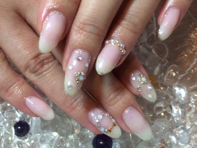 デザインを持ち込んで下さいました。淡いピンクのカラーにストーンやパールをビジュー風に散りばめました。春らしい女子力満載のネイルです☆