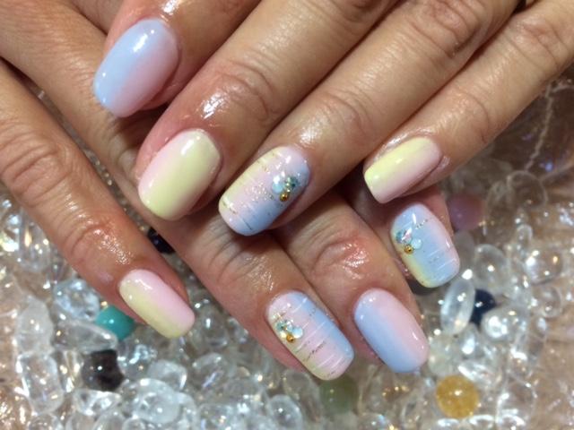 キャンペーンネイルからパステルカラーの縦グラデーションです。少し華やかになり過ぎるかな、と気にされてましたが、淡いお色の組み合わせなので、それほど派手な印象では無いと思います☆