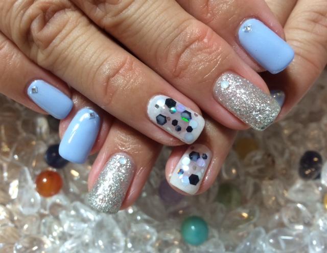 キャンペーンネイルから選んで頂きました。サンプルではピンクベースだったデザインをブルーベースに変更されました。お色を変えるだけで雰囲気もかなり変わります。お色を変えてみるのも楽しみのひとつですね☆