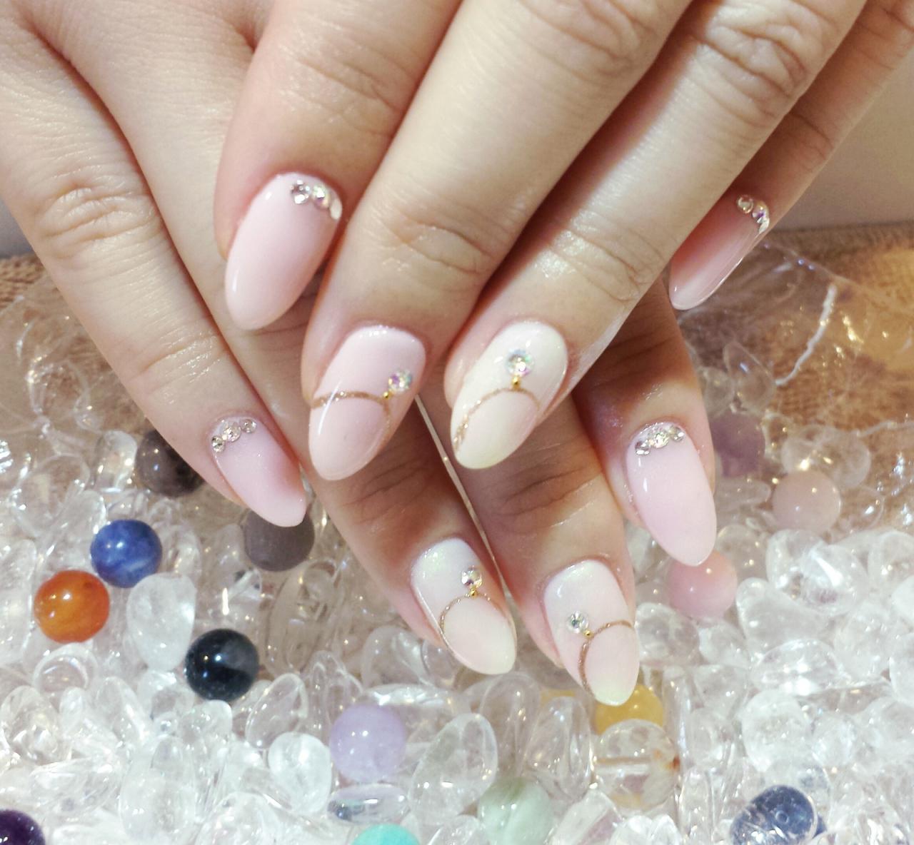 本日のお客様ネイルです。ネックレスのようなデザインが目を引く優しい雰囲気のネイルになりました♪