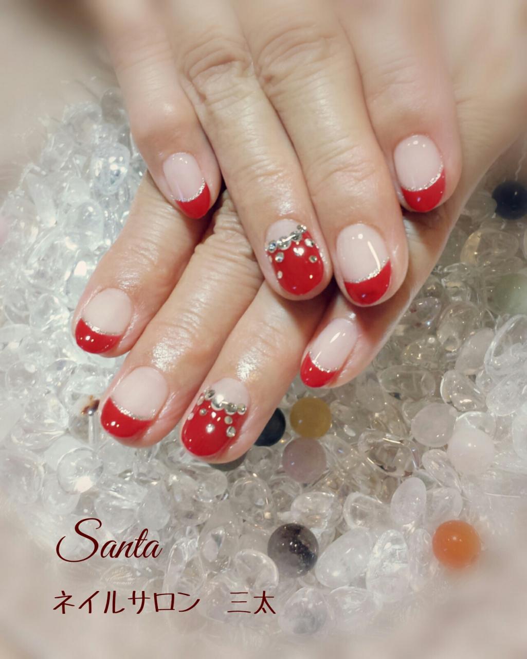 本日のお客様ネイルです。赤ネイルにされました。親指&薬指にはクリスタルのストーンを置いてキラキラになりました♪