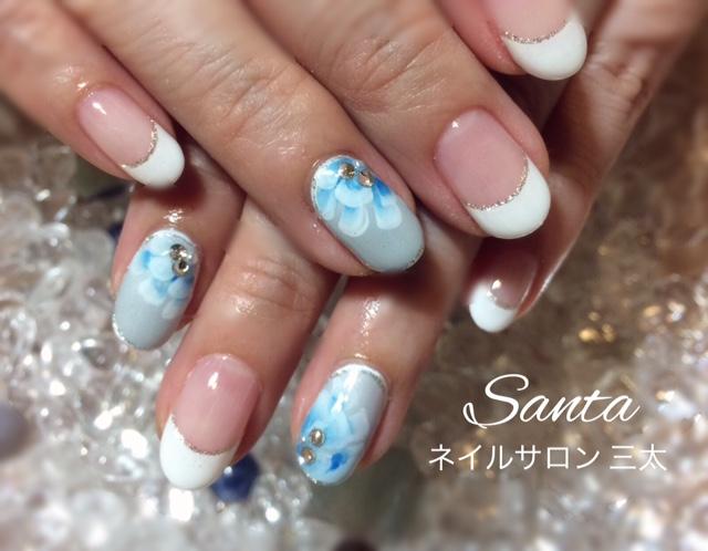 キャンペーンネイルから…ジェルのグラデーションを使ったお花のアートです。白いフレンチとブルーグレーもまた初秋に似合うお色味ですね☆