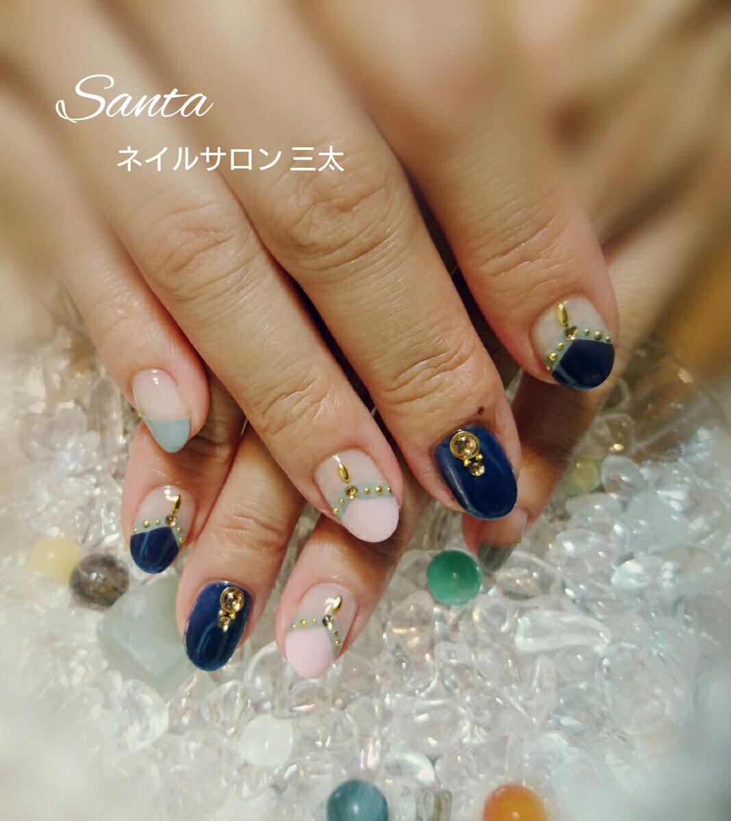 本日のお客様ネイルはキャンペーンネイルより選んで頂きました。見本チップではグリーンだった色を紺色にされました。紺が入ると秋らしさがアップしますね♪