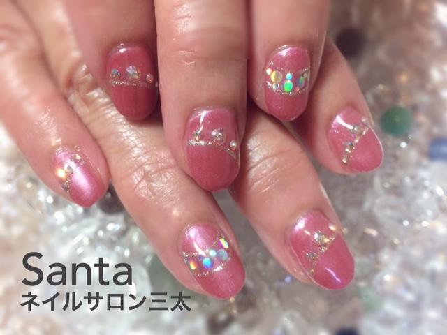 落ち着いた深めのパールピンクがお客様の肌色にとても馴染んでいて綺麗ですね。ストーンとホログラムでキラキラに。クリスマスにもお正月にもOKなデザインです☆