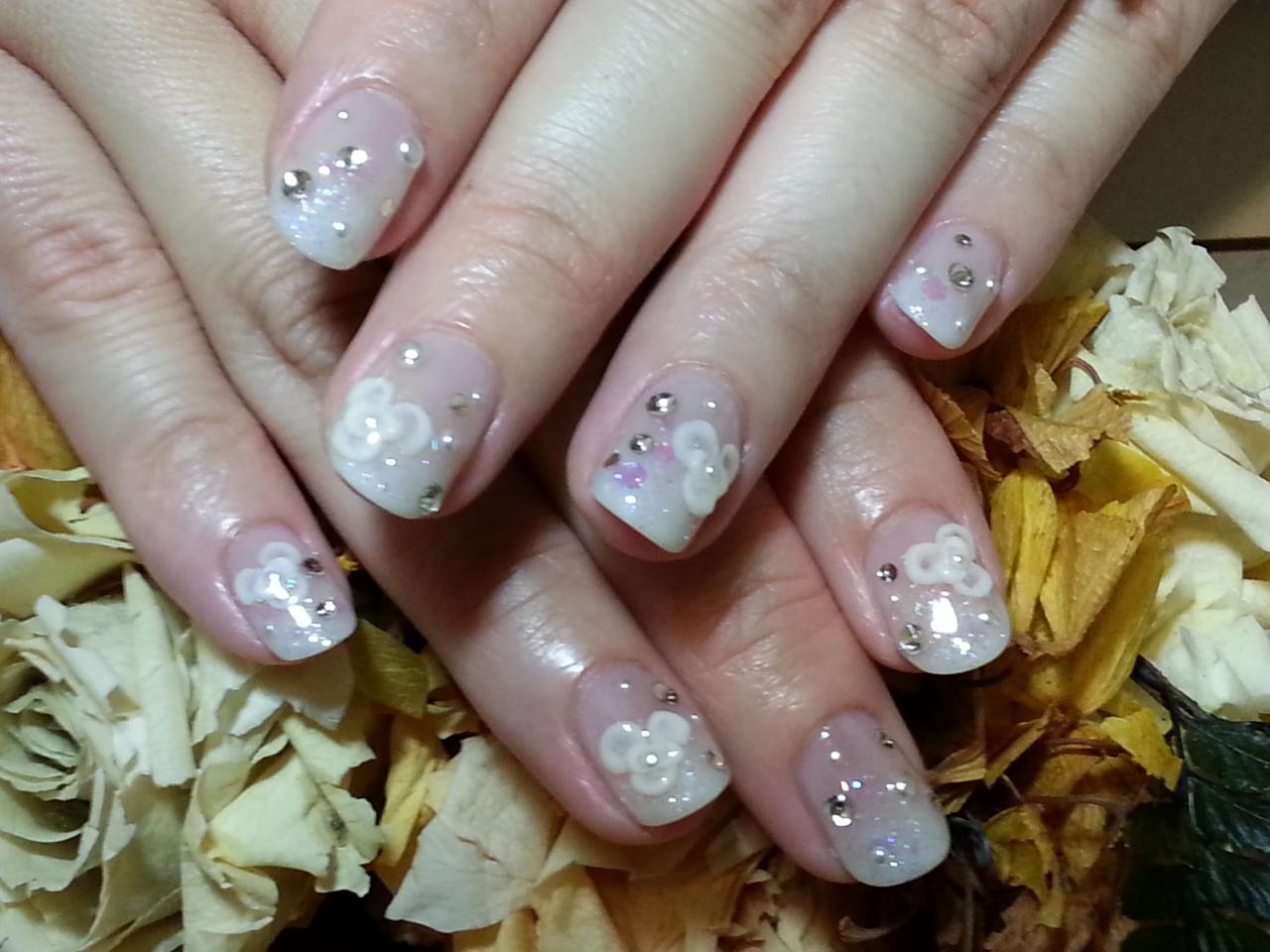 白色にラメとホログラムを足してベースを作り、アートは3Dの花とストーン、パールを使いました。