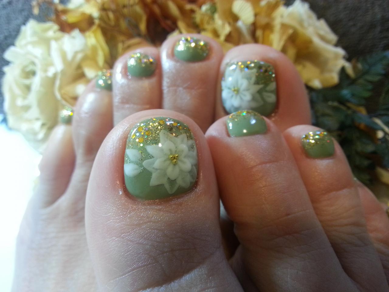 ハンドはお仕事上、難しいのでいつもフットネイルをして頂いています。和な感じのグリーンに3Dアートが素敵です。