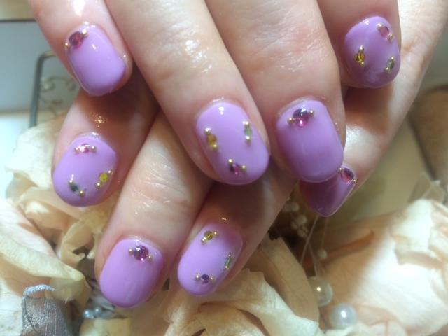 キャンペーンネイルから、パープルカラーにストーンを散りばめました。キャンディーみたいな色合いのストーンが可愛いです☆