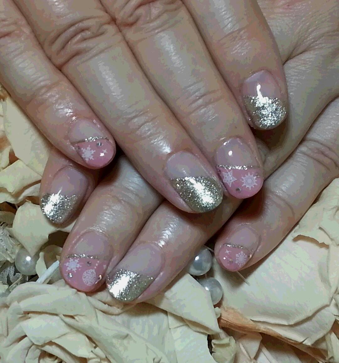 本日のお客様ネイルです。雪の結晶にストーンを置きました。今の季節にピッタリのデザインで素敵です♪