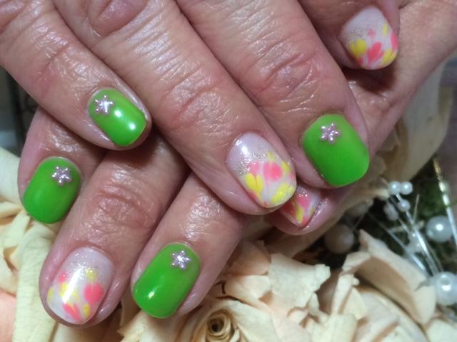 キャンペーンネイルから選んで頂きました。ピーコックのアートと鮮やかなグリーンがとても綺麗です☆