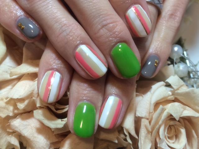 キャンペーンネイルから。お見本では中指はピンクでしたがあえてグリーンに変更されました。鮮やかなグリーンがいい感じにアクセントになってます☆