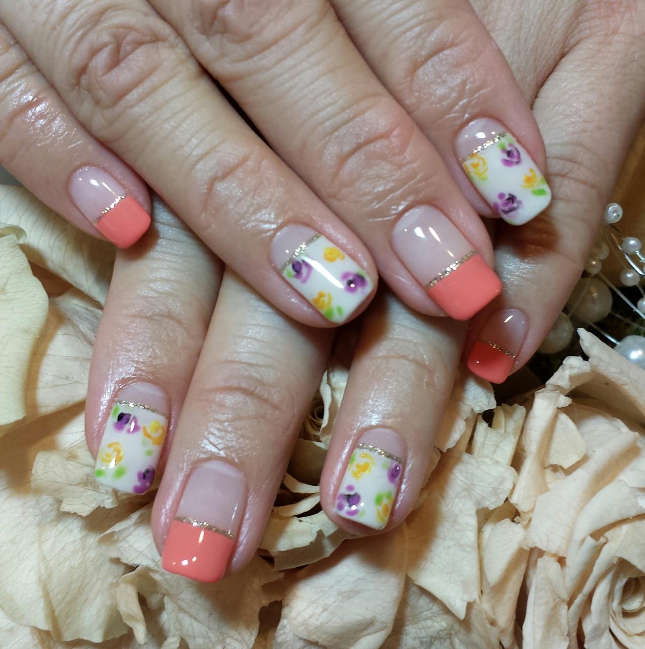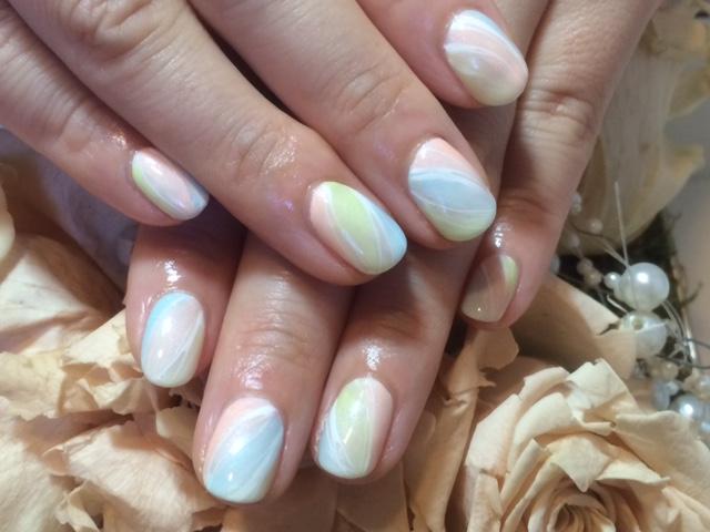 キャンペーンネイルから。お見本では中指はピンクでしたがあえてグリーンに変更されました。鮮やかなグリーンがいい感じにアクセントになってます☆