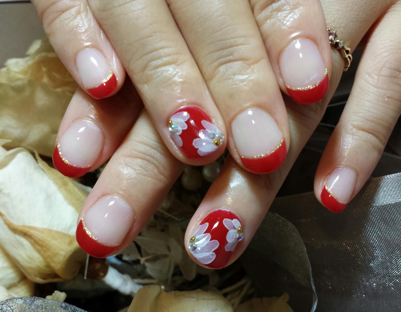 本日のお客様ネイルです。キャンペーンネイルより選んで頂きました。薬指には透け感のあるお花をされ、赤色に合い、素敵です。