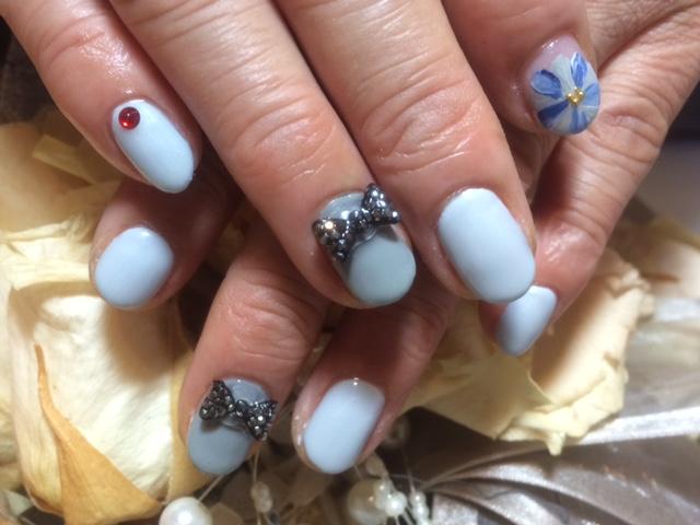 新しいグレーのカラーを使って、濃淡のある単色塗りです。お花のアートやリボンのパーツがポイントです☆