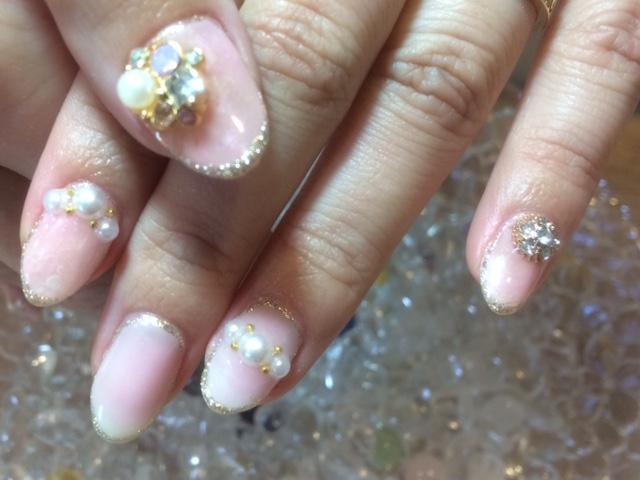 ピンクのベースカラーに大理石柄とチークネイルのミックスです。淡いお色なので画像では少しわかりにくいですが…。親指には大き目のビジュー風パーツを乗せました。ピンク&ビジューで女子力満載のネイルです☆