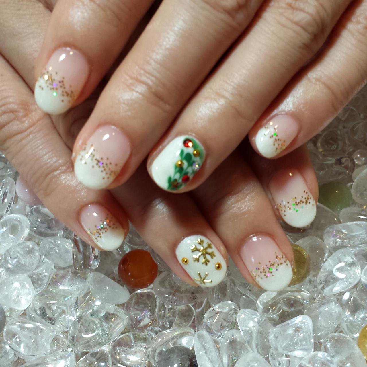 薬指のクリスマスツリーがとても人気のデザインです。雪の結晶も入り、素敵なネイルになりました。