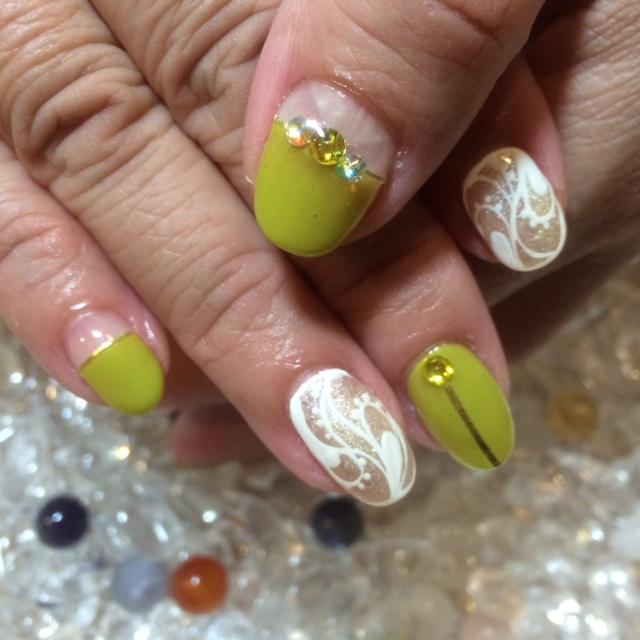 ピスタチオカラーとペイズリー柄です。前回のキャンペーンネイルでも人気のデザインでした☆