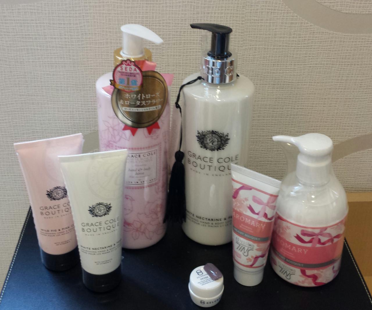 本日は新商品のご案内です。左の商品4つはグレースコールです。ネイルの卸屋さんでも一番人気。ポンプ式(500ml)は1500円というお値段も魅力的です。