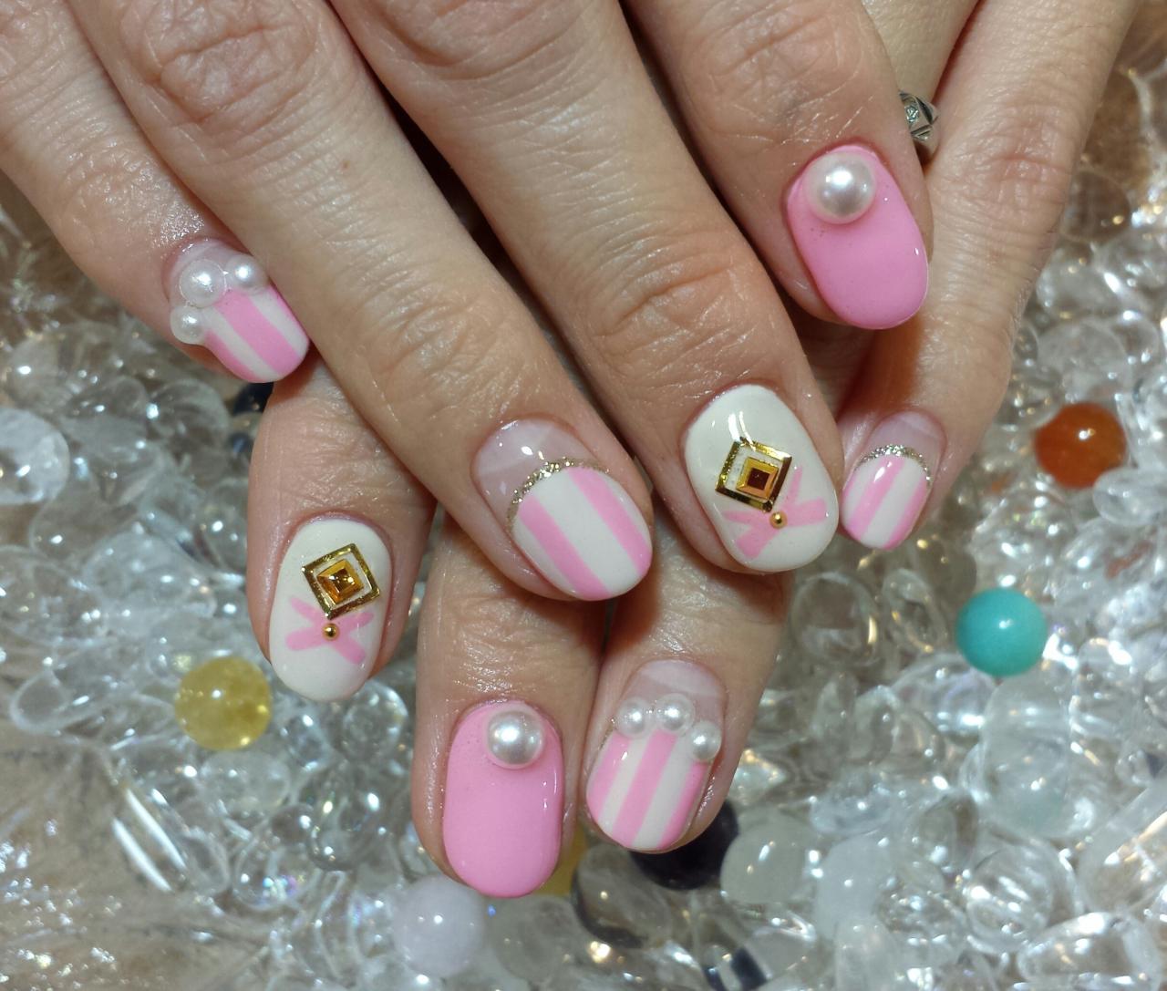 本日のお客様ネイルです。デザインを持ち込んで頂きました。今年も大きいパールは人気です。ピンク&オフホワイトが春らしくて可愛いですね♪