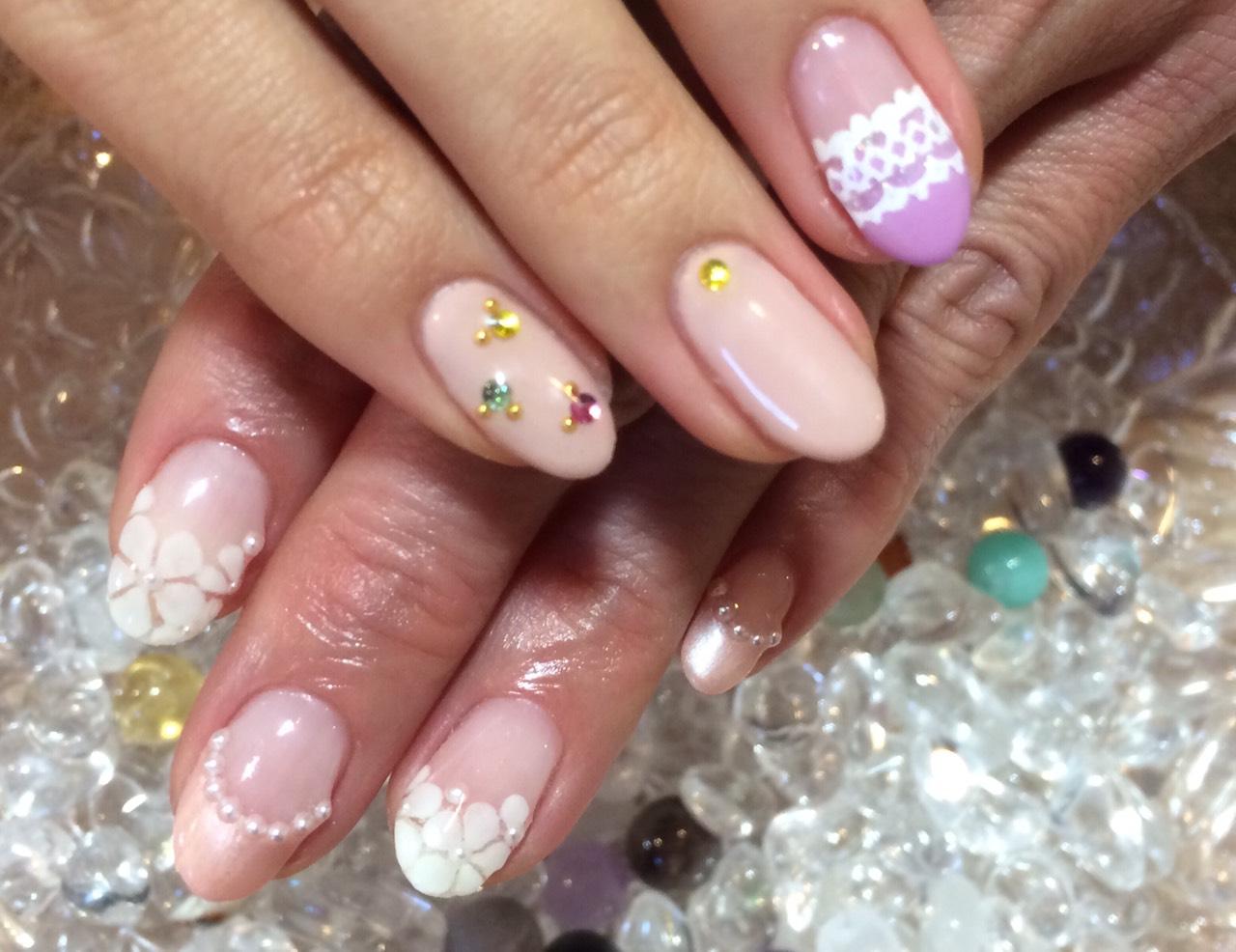 お嬢様はお肌馴染みの良いベージュを塗り、アクセントにビジュー風にストーンを置かれました。春らしい可愛いネイルになりました♪