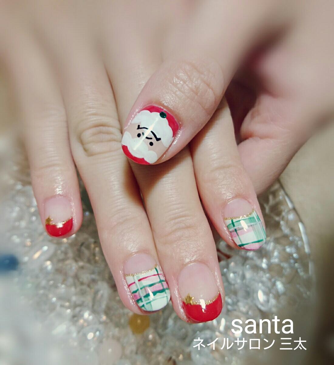 本日のお客様ネイルです。グッと寒くなりクリスマスネイルが人気です。1枚目の写真はサンタさん&チェック柄が可愛いです。