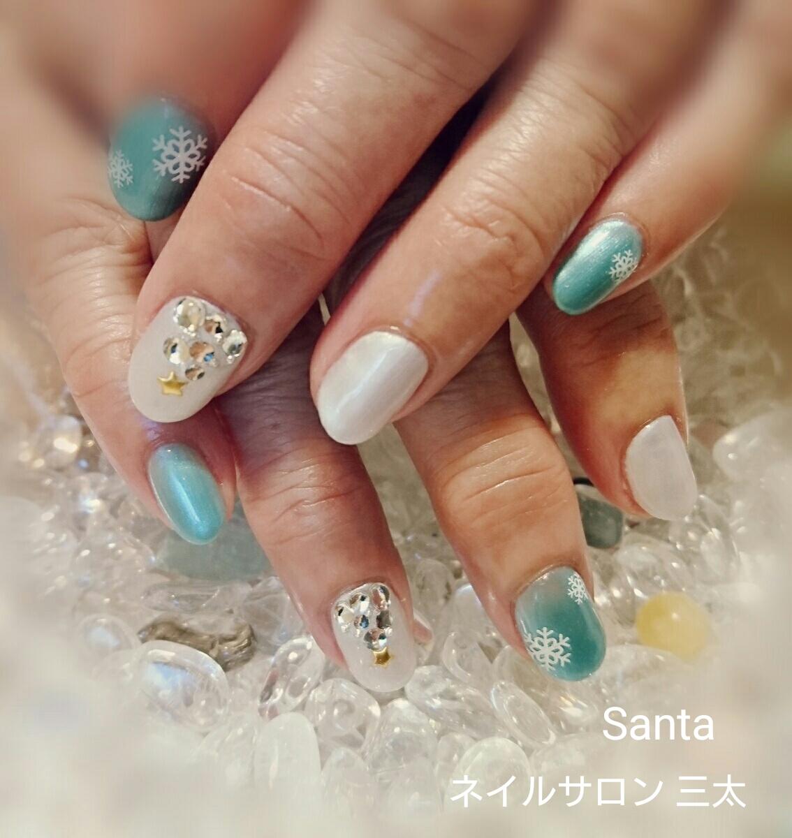 本日のお客様ネイルです。ラインストーンでクリスマスツリーの形を作っています。カラーも白とブルーで素敵なクリスマスネイルになりました♪